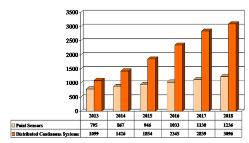 作為物聯(lián)網(wǎng)極其重要的組成部分之一,光纖傳感器因其優(yōu)勢與應(yīng)用一直備受矚目。從全球市場來看,2013年全球光纖傳感器市場規(guī)模為18.9億美元。預(yù)計2014至2018年,全球光纖傳感器市場將以年均18%的增長幅度增長,至2018年市場規(guī)模達到43.3億美元。從光纖傳感技術(shù)研究上看,美國對該技術(shù)的研究起步最早,且在世界上最為先進。